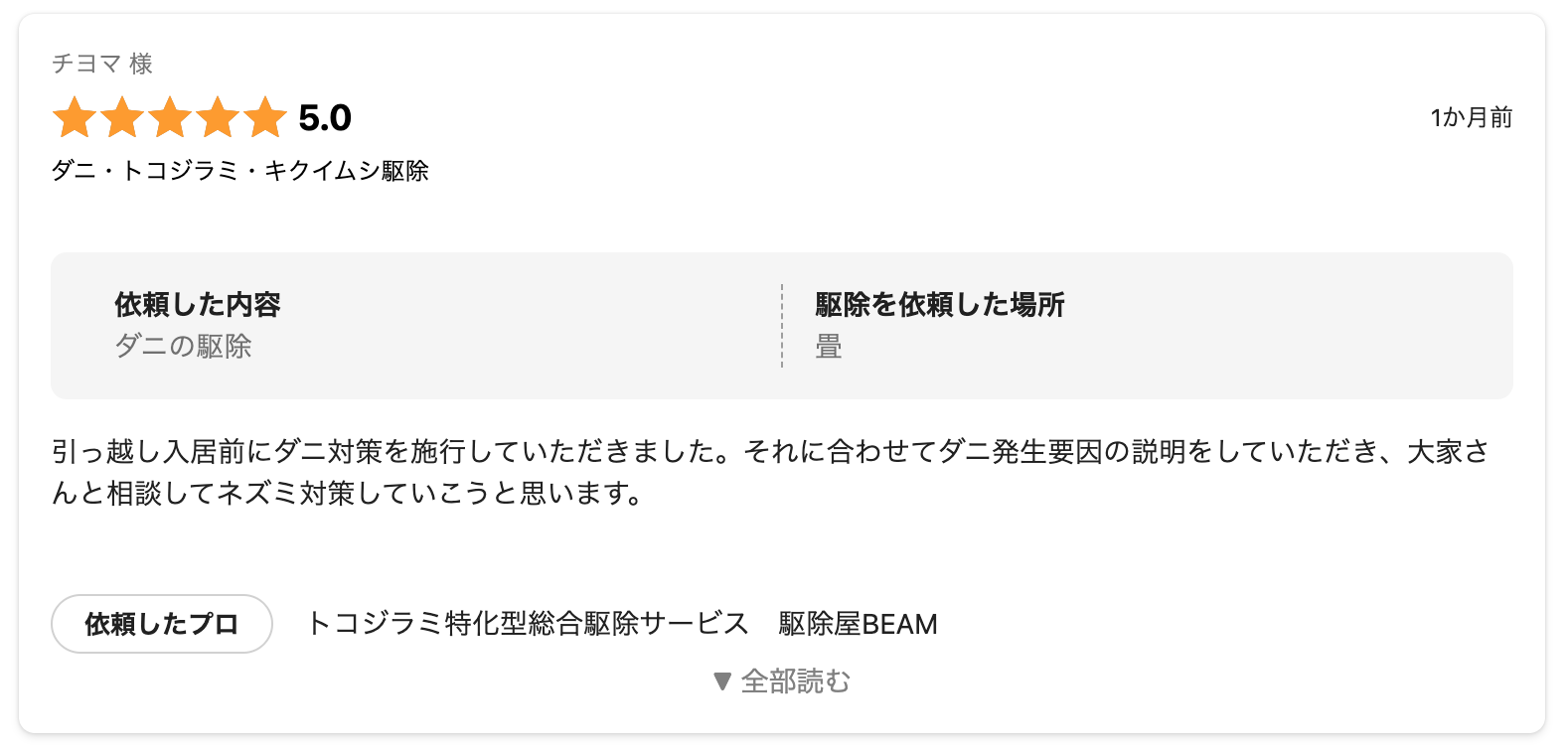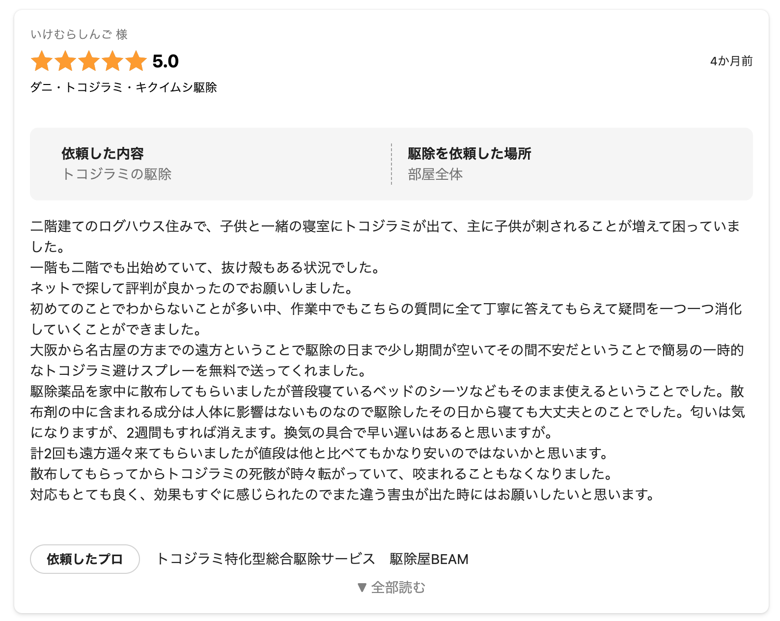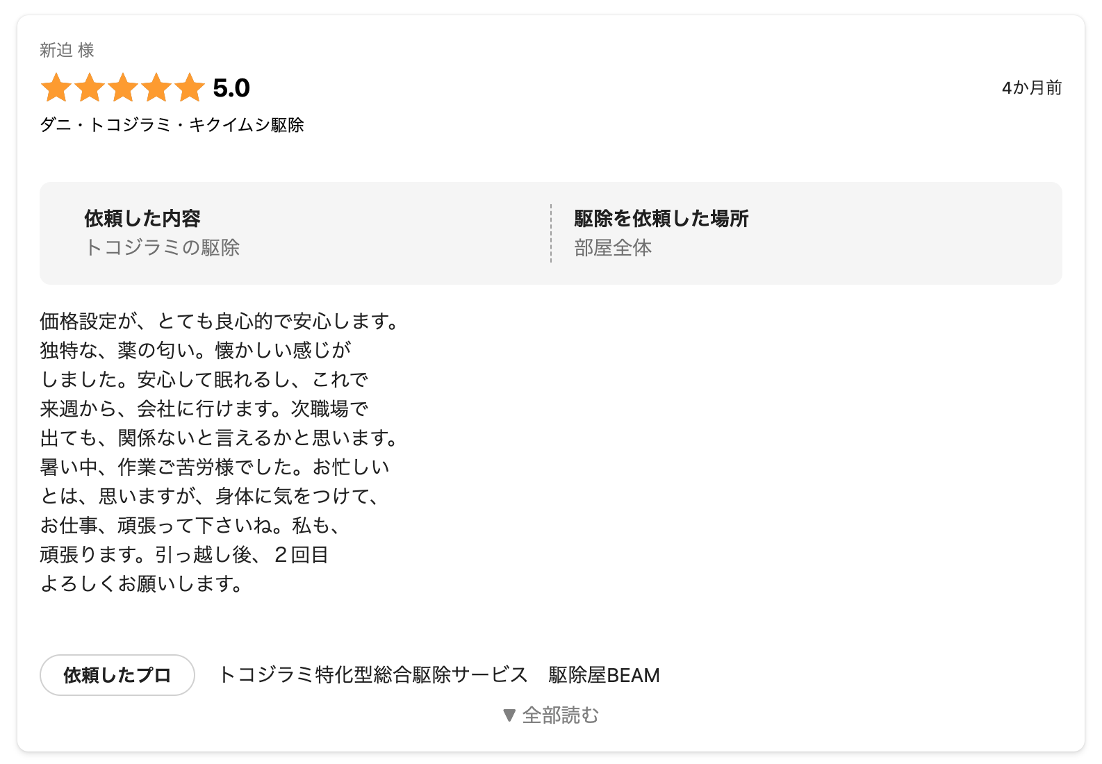 結論﹦駆除であれば安い方がいいですよね。それが弊社の考え方です。他には他社には無い独自の施工方法や薬剤によって今まで駆除に苦労したトコジラミやダニなども徹底的に駆除します。