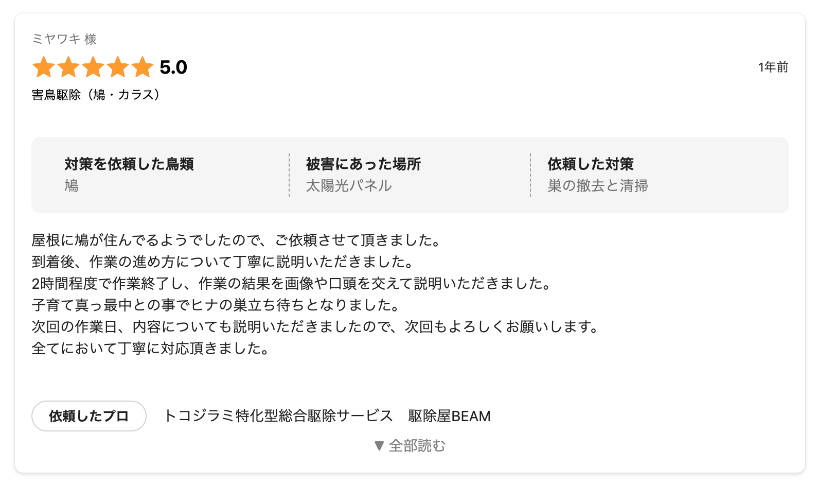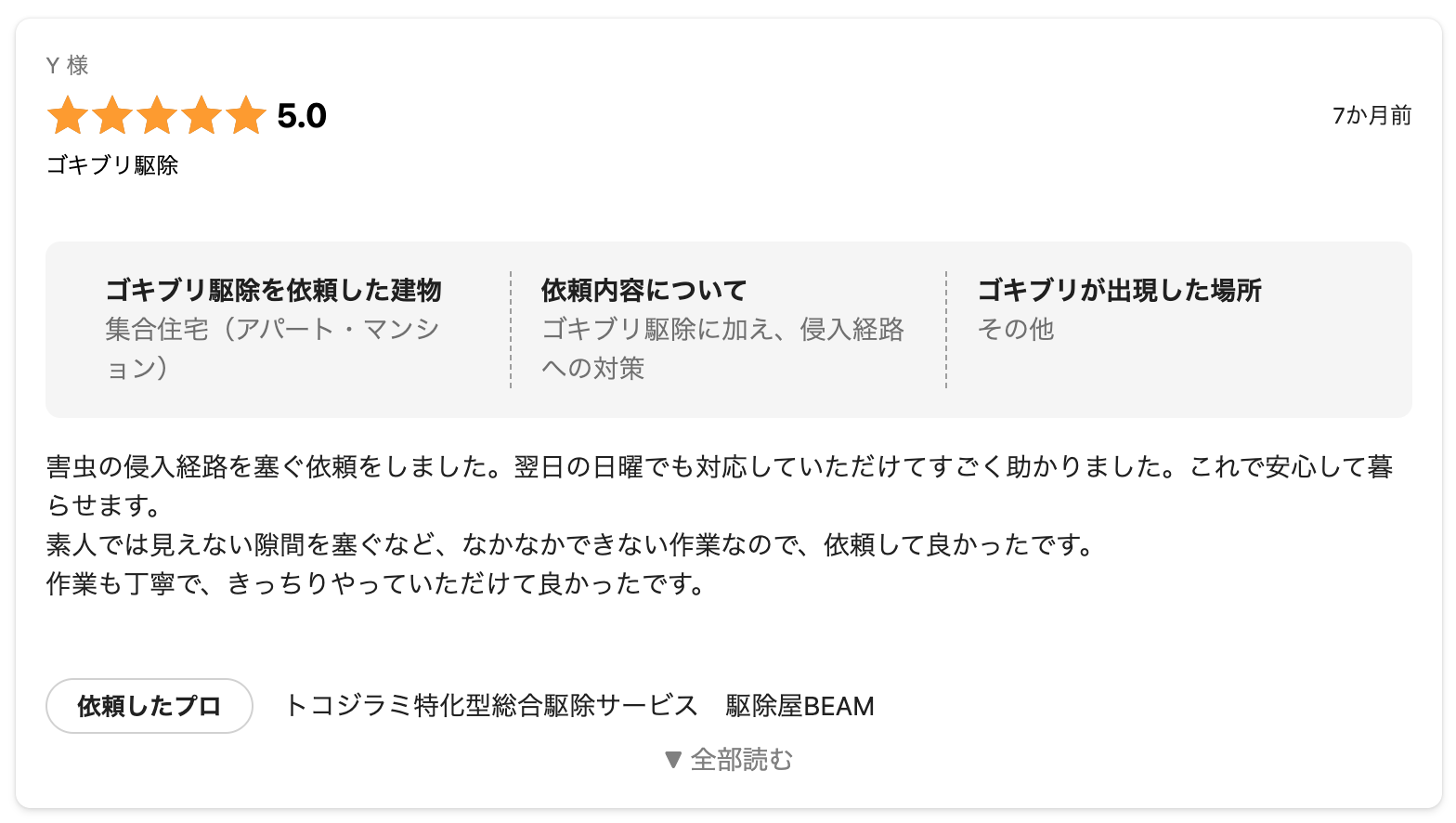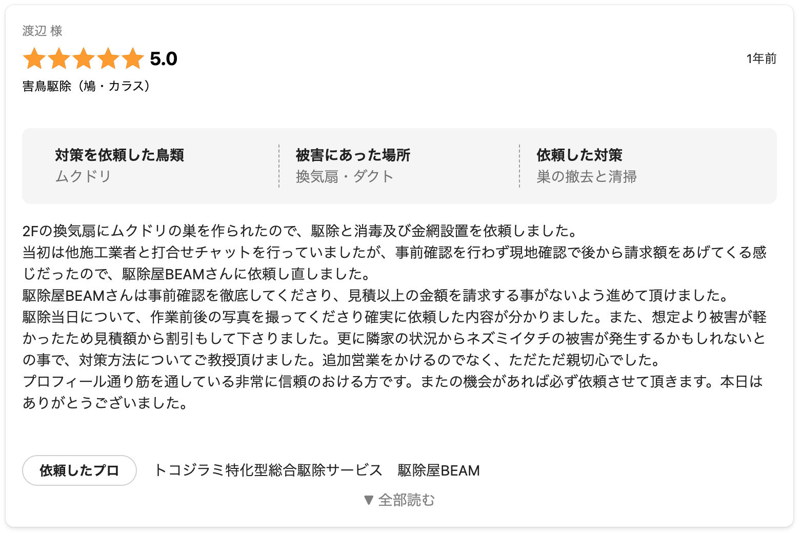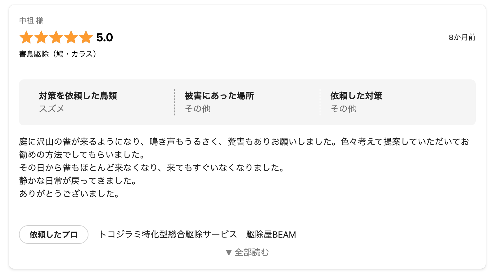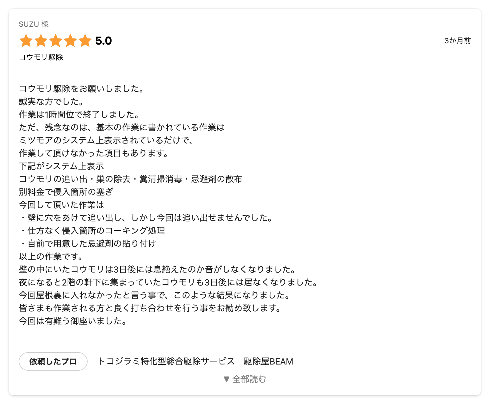 駆除できると言いながら無関係の薬剤を撒いて高額な費用を請求、作業はちゃんとしてるが3倍以上の高額請求、先払いしたら連絡付かなくなった、など様々です。